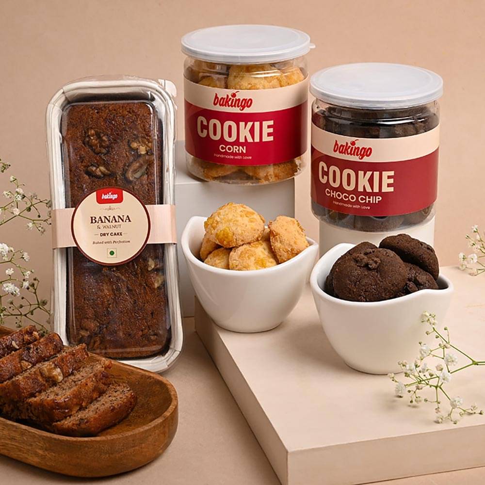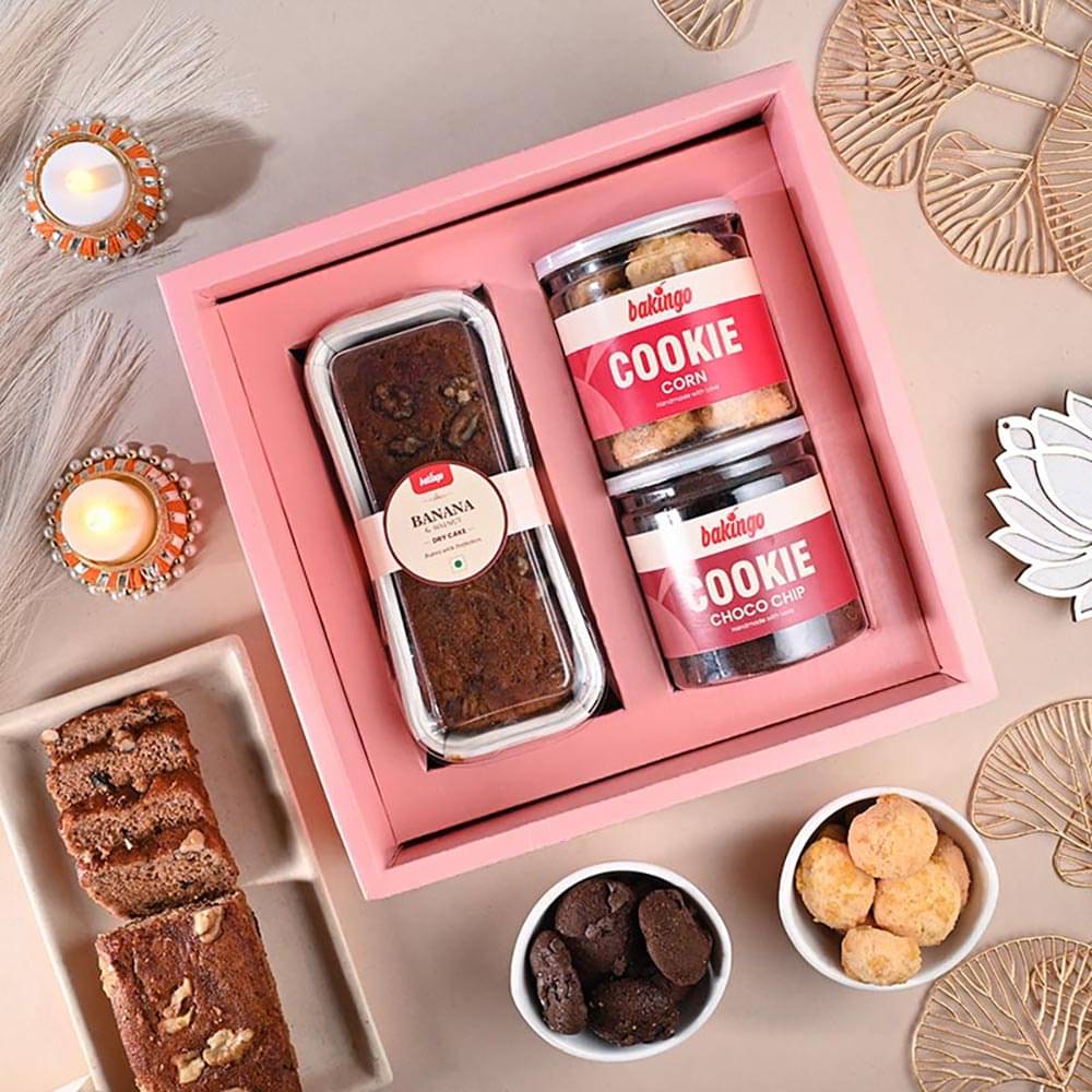This Diwali, illuminate your loved ones' hearts with joy through our exquisite range of online Diwali hampers. At Bakingo, we've curated a splendid selection of Diwali gift hampers that bring together an array of delectable delights, perfect for sharing the festival's spirit with your loved ones. Indulge in the goodness of dry cakes, including irresistible flavors like Banana Walnut and Dense Loaf. For chocolate lovers, our assortment features an array of Brownies infused with luscious variations such as Walnut, Biscoff, and Nutella. The jar cakes, a testament to our baking expertise, encompass a spectrum of flavors ranging from classic chocolate and red velvet to exotic options like Oreo, mousse, biscoff cheesecake, and butterscotch. But that's not all – the Diwali hampers also encompass a variety of cookies that contain a medley of textures and flavors, from the classic choco-chip to the sophisticated almond, coconut, and corn cookies. Celebrate this festival of lights with sweetness by gifting your loved ones these delightful diwali gift hampers. At Bakingo, we craft these hampers with the finest ingredients and abundant care, making them the perfect mode of your warm Diwali wishes and greetings. Convey love and care this Diwali with a range of delicacies baked with precision.